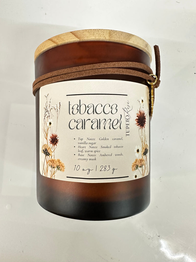 Welcoming the fall season in with our Tobacco Caramel candle. This beautiful, handcrafted candle features leather trim and gold leaf charms. A smooth, indulgent blend of warm pipe tobacco and buttery caramel, wrapped in notes of amber and vanilla. This inviting fall fragrance evokes the comfort of an old leather chair, a cozy fire, and the lingering sweetness of golden smoke. Rich, sophisticated, and irresistibly warm — the perfect scent to welcome the season.